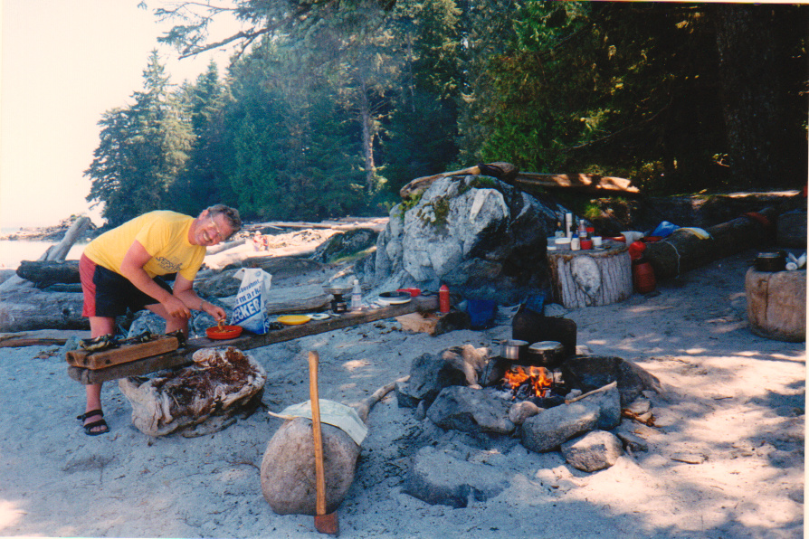 I will also not forget how we had a fishing line attached to the kayak and all of a sudden the paddling seemed harder. Wow! A good sized salmon was on the line and fighting to get off. As my friend started to reel it in it took just a moment and an eagle dove down and stole our supper. We had to cut the line, we had no choice. Camping on different small islands we harvested mussels and oysters, cooked them in ocean water and sometimes shared them with other campers.