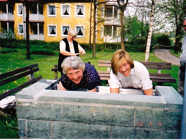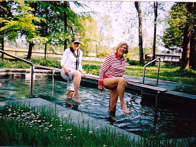 The easiest water treatments are the ‘water stepping’ and the cold ‘arm bath’. All Kneipp Spa cities and most Kneipp Groups in villages and towns have established water stepping sites along their hiking and walking trails in forests, meadows, and many resting places in parks. After a good hike the water stepping is very refreshing and surely will avoid swollen and tired legs. The water usually comes from a stream and is quite cold. You walk through the basin two or three times like a stork, lifting the leg out of the water for an exchange of air-water, air-water until the cold “bites”. Now it’s time to get out and walk on the adjacent lawn until your feet are dry and starting to get warm; sit down on a bench and put socks and shoes back on. Just use your fingers to rub the place between the toes dry to avoid the moist warm spots that fungus likes.